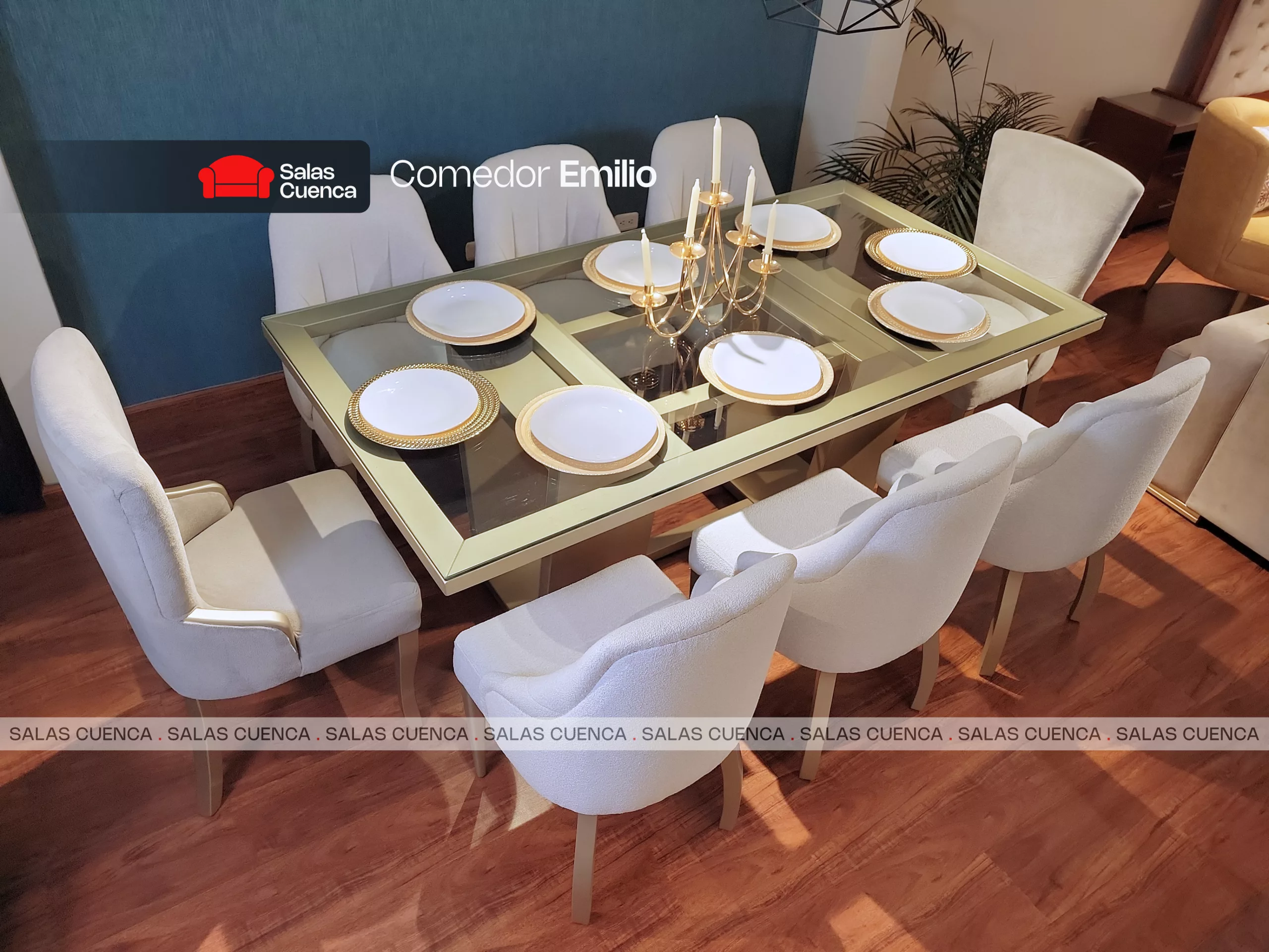 Este Comedor Emilio con un tapiz antifluido y tablero de vidro, ideal para compartir con hasta 8 personas.