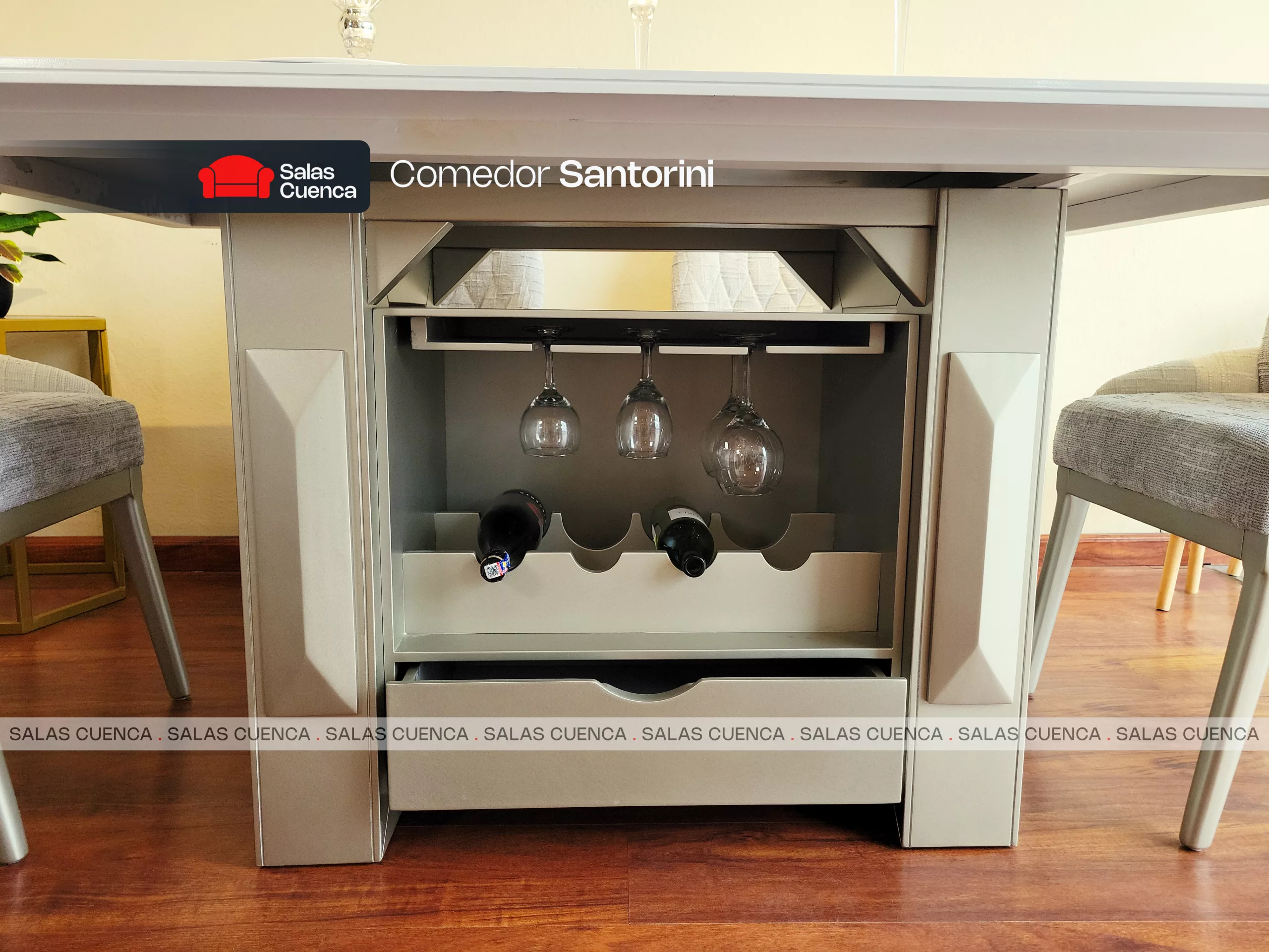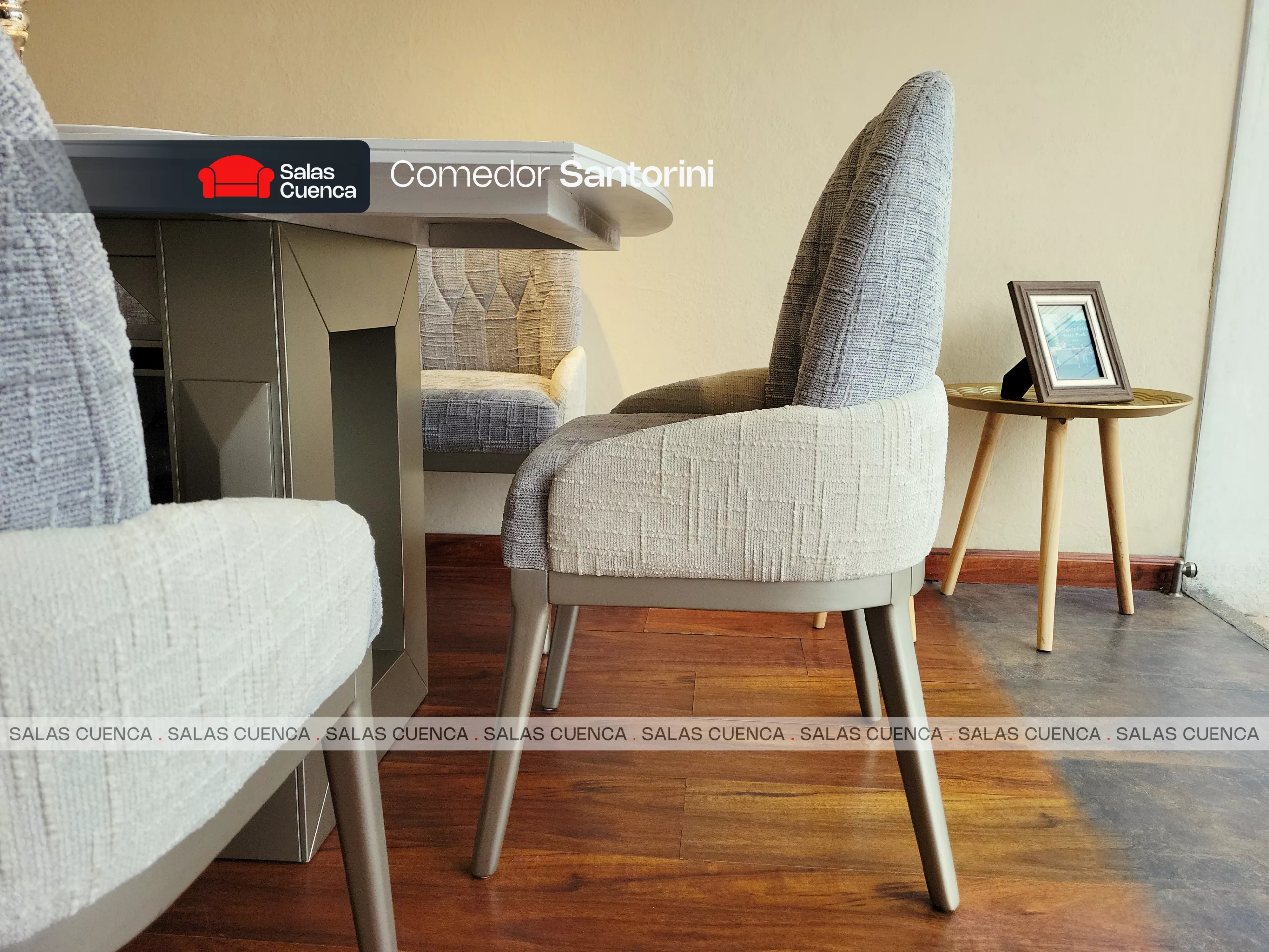 Este elegante Comedor Santorini fabricado con un tapiz antifluido y tablero marmoleado, ideal para compartir con hasta 6 personas. La base del comedor es tipo vinera.