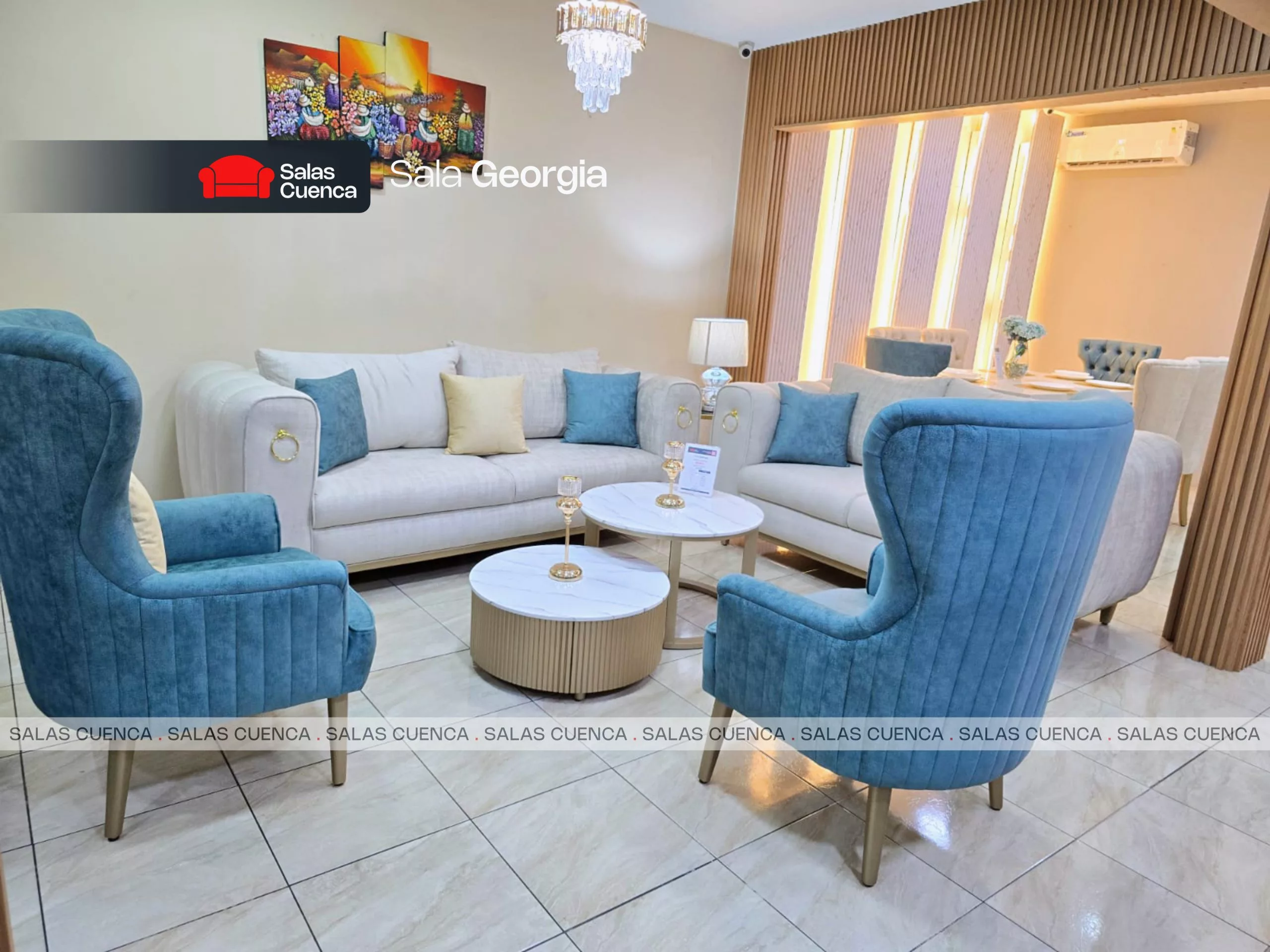 Este juego de Sala Georgia consta de un mueble triple, mueble doble, 2 elegantes poltronas y 2 mesas de centro con tablero marmoleado y cajón en una de ellas. Un plus de esta sala Georgia es que es elevada del piso lo cual hace que sea ideal para quitar objetos de debajo con facilidad.