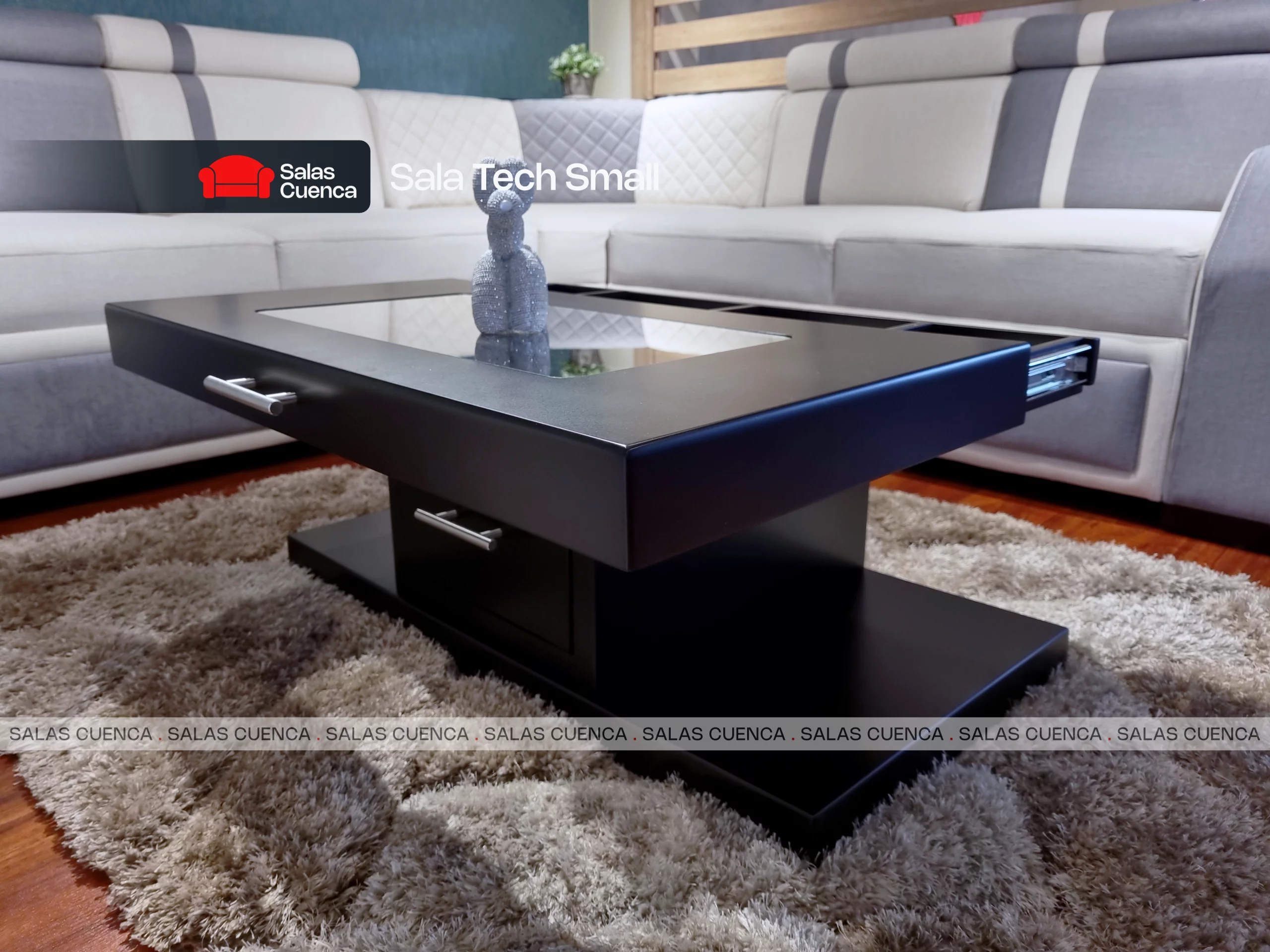 Sala Tech Small ideal para espacios de 3m x 3m para compartir con tus seres más cercanos, esta sala en L con 2 pufs es ideal para 7 personas. Esta sala en L tiene dos detalles que le hacen diferentes: Sistema integrado de audio, video y carga por cable para tus dispositivos.