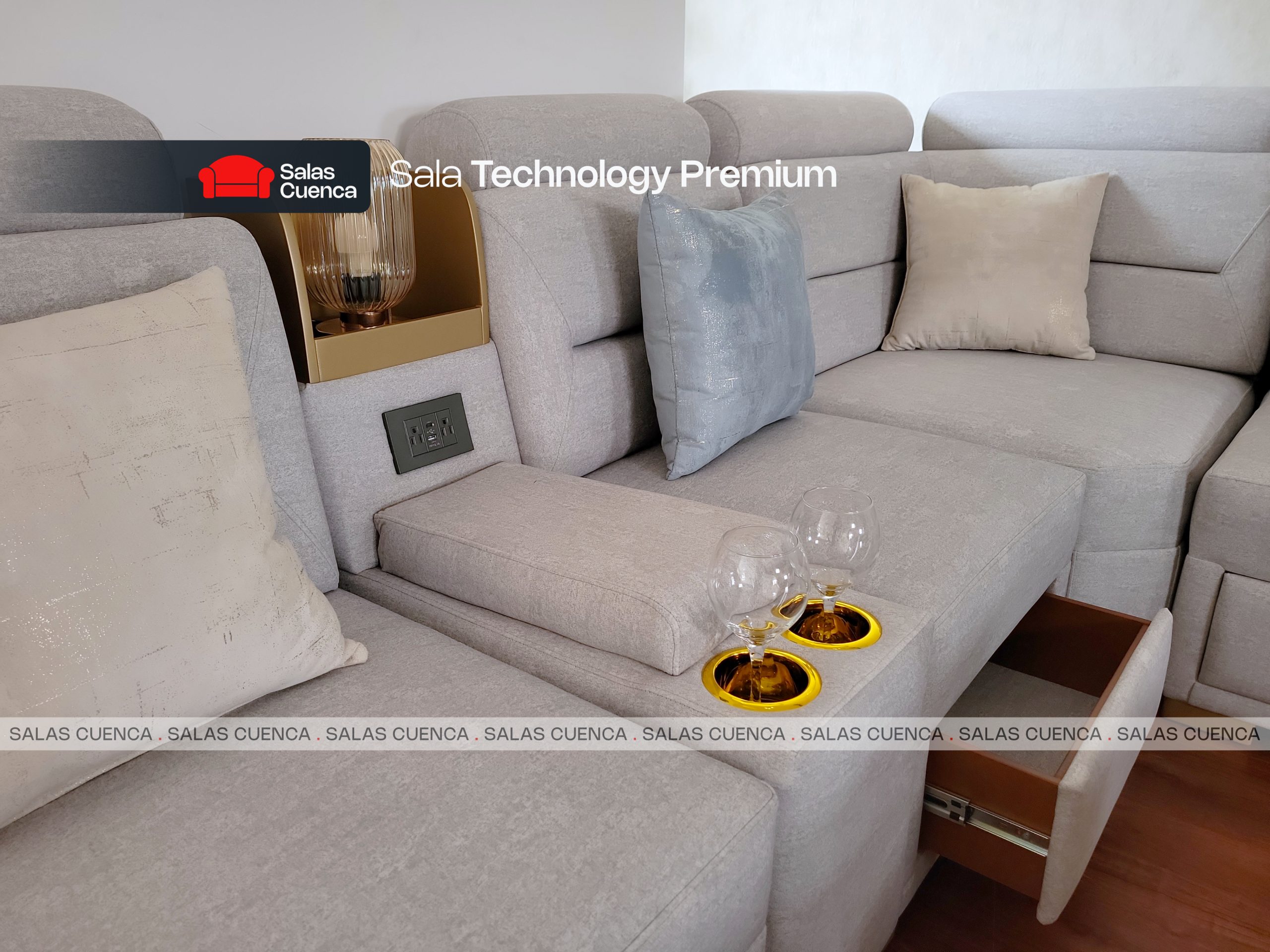 Sala Technology Premium con pantalla android, además cajones para guardar tus objetos. Disfruta con hasta 12 personas y un práctico repisero en el lateral del perezoso. Incluye dos mesas de centro.