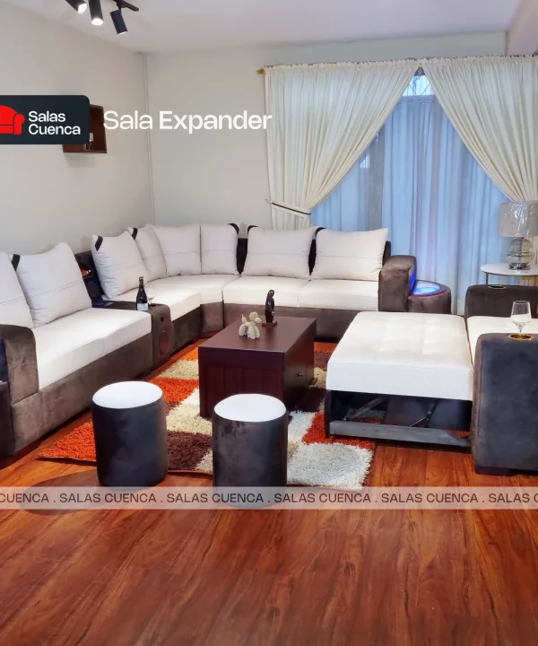 Sala Expander para espacios de 4m x 3m. Disfruta de un cómodo mueble sofá cama, esta sala en L con individual es ideal para 9 personas. La mesa de centro incluye una vinera debajo del tablero, esta si es a otro nivel.
